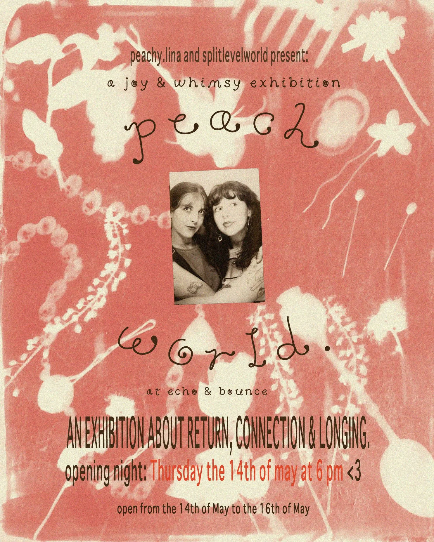 PEACH WORLD IS COMINGPRESENTED BY SPLITLEVELWORLD & PEACHYLINA A THREE DAY EXHIBITIONOPENING NIGHT, THURSDAY THE 14TH OF MAY AT 6 PMCOMING TO ECHO AND BOUNCE IN MEANJINBROUGHT TO YOU BY JOY & WHIMSY BUY TICKETS BUY TICKETS @peachy.lina @peach.house.forever