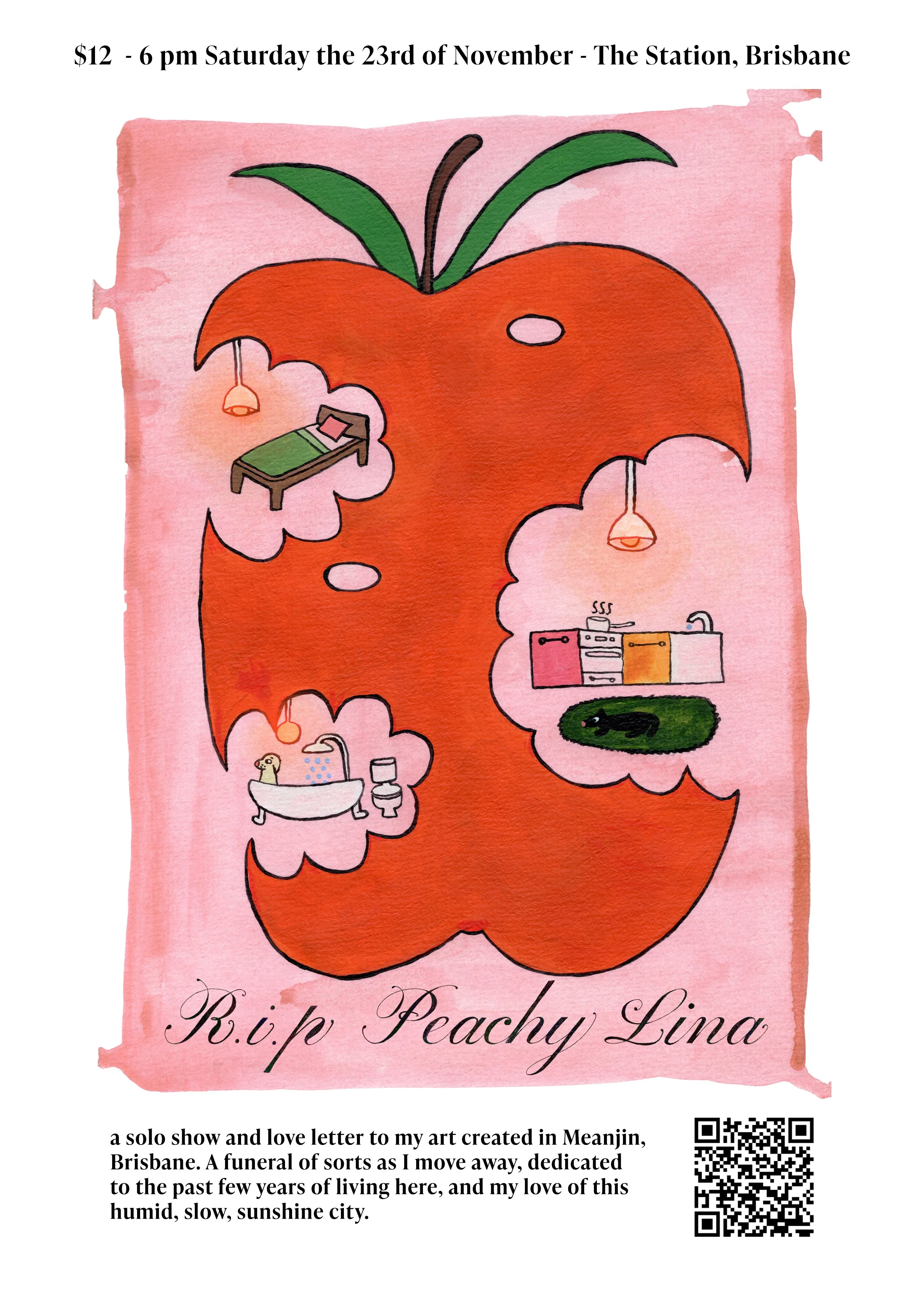 ‘R.i.p Peachy Lina, a show and love letter to my art created and friends made in Meanjin, Brisbane. A funeral of sorts as I move away, dedicated to the past few years of living here, and my love of this humid, slow, sunshine city. By no means is ‘Peachy Lina’ dead (lol) But I do think it appropriate to have a funeral of sorts, dedicated to how glorious and special it is to be here, and to create art here, as I leave for new things.’